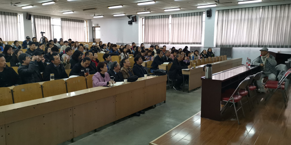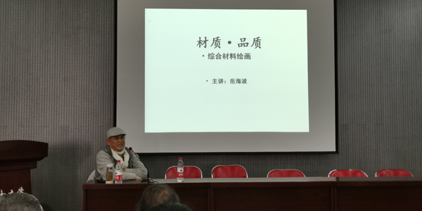 岳海波从综合材料绘画的现状分析、绘画的技术要点、绘画的风格、绘画的功能与本质、时代绘画的基本特征和我的艺术追求六部分给全体师生带来了一场精彩的讲座,他介绍了综合材料绘画,并提出运用两种以上材料的表现方法和不同材质对比的原生态理论,岳海波指出,绘画讲究流畅自然,要兼顾品格和味道,要有纯粹的艺术追求;绘画要有创造力与想象力,要表达出文字无法表现的东西,甚至是喜怒哀乐;绘画要 “面向当代,面向世界,面向未来”,要创造转型和创新发展。最后通过个人部分作品和大家分享了具体的制作过程和技术。