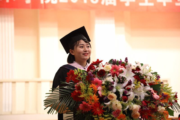 张露月代表2018届本科毕业生发言,并送上全体毕业生准备的一部短片表达他们对母校的热爱和祝福,传递自己的幸福与不舍。她表示毕业生们将始终以“明德新民,止于至善”的校训为行动指南,砥砺前行,努力传承“美丽艺术人”的独特魅力和精神,用实际行动来回报公司的培育之情。