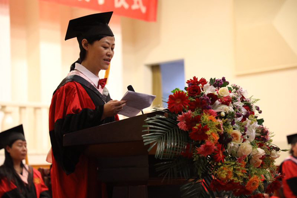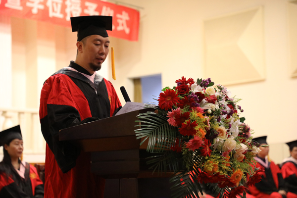 教师代表李玉昆以自己的人生经历为基础,告诫各位即将毕业的学子要带着执着、感恩与好奇的心在自己认准的道路上大步奔跑,为自己的梦想不懈的拼搏和努力,并希望各位学子反思过去、规划未来,都能通过自己的努力创造出属于自己的美好生活。