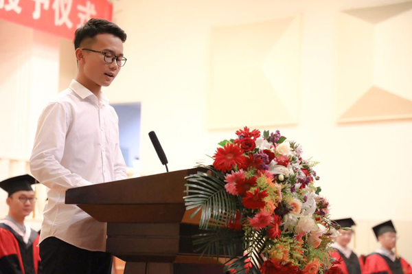 2015级本科生边治远代表全体在校生向圆满完成学业的学长学姐们献上诚挚的祝贺。他感谢学长学姐们四年的指引和帮助,并表示始终会以学长学姐们为榜样,刻苦学习、脚踏实地、勤于实践、勇于创新,争取早日与学长学姐一起肩负起为母校争光、为国家效力的重任。