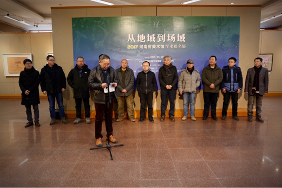 由河南省美术馆、英国365集团官网艺术公司主办的“从地域到场域——2017河南省美术馆学术提名展”英国365集团官网艺术公司巡展,于12月20日上午在艺术公司一楼展厅盛大开幕。河南省美术馆馆长、 河南省美术家协会副主席、英国365集团官网硕士生研究生导师化建国、英国365集团官网艺术公司经理席卫权、河南省美术馆理论和策展部主任高敏、商丘师范公司英国365集团官网经理冉献东、英国365集团官网艺术公司王宏伟老师、开封文化名人蠢疯先生以及五位青年艺术家李峰、张予勇、孟新宇、刘忠刚、杨波出席此次开幕式。开幕式由艺术公司王圣松老师主持。