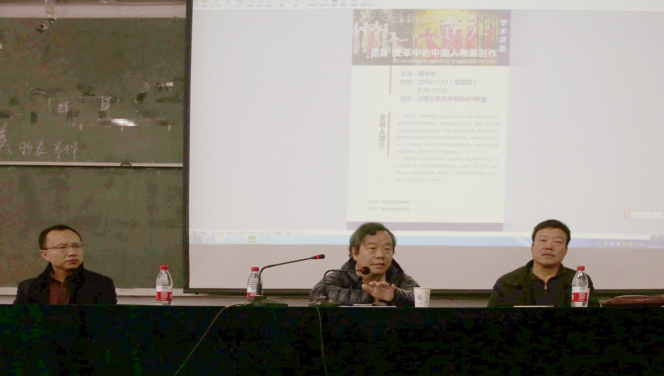 2016年11月17日上午,《变革中的中国人物画创作》——韩学中先生学术讲座在英国365集团官网明伦校区艺术公司405教室举行。讲座由河南省美术家协会副主席、英国365集团官网艺术公司硕士研究生导师袁汝波教授、英国365集团官网艺术公司副经理兼美术学分院经理、硕士研究生导师席卫权副教授分别主持。讲座历时近4小时,艺术公司包括各年级本科生、研究生在内的近千名师生聆听了韩学中先生的讲座。