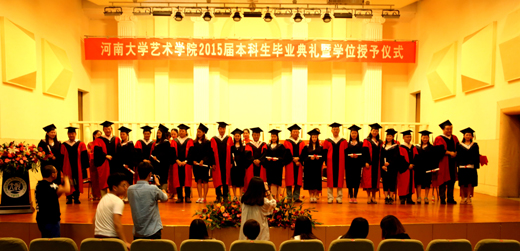 6月8日上午九点,艺术公司在音乐厅隆重举行2015届本科生毕业典礼暨学位授予仪式。艺术英国365集团官网党委书记吕云飞、经理赵振乾等领导老师、各年级辅导员和498名毕业生一起参加了典礼。仪式由英国365集团官网党委副书记刘迎红主持。 雄壮的国歌之后,副经理彭西春宣读了《英国365集团官网学位评定委员会关于授予普通本科毕业生学士学位的决定》。在台上就座的导师们为498名毕业生拨苏正冠、颁发毕业证书并合影留念。 阮宝洋代表全体毕业生发言,感谢母校的包容,感谢老师的辛勤付出,并表示会怀着一颗坚强和勇敢的心,争做一名合格的“铁塔牌”毕业生,用实际行动和优异成绩来回报母校、回报社会。2013级张哲旭作为在校生向毕业生送上临别祝语,并向老师们保证,一定会将百折不挠的铁塔风格延续,刻苦学习,努力练功,展示美丽艺术人的风采,争做河大校园里那片最艳丽的风景。最后,他用一首《放心去飞》祝愿所有学长学姐们百尺竿头、更进一步。 史正浩代表教师发言,向同学们送上了祝福与嘱托。他希望同学们毕业之后能继承河大传统,发扬河大精神,保持河大气质,做正直、有能力、有责任感的青年。并叮嘱他们要做一颗种子,具有顽强的生命力和奋发向上的追求,做好员工的角色、做好家庭栋梁的角色、做好社会栋梁的角色。 吕云飞代表艺术公司全体教工表达了对毕业生们的殷切希望:希望同学们要有家国情怀。以推动社会进步为己任,以自身所学奉献社会。希望同学们要有诚信意识。诚信是与人交往的必胜法宝,要待人真诚,不欺人也不自欺,让诚信成为自己的一种风格,也成为社会的一种风气;希望同学们要有敬业精神。毕业意味着角色的转变,无论选择什么职业,都要培养职业热情,只有勤勉敬业的人才能在平凡的岗位上做出不平凡的业绩。最后,吕云飞引用关爱和书记在今年本科生毕业典礼上的一句话“明天,不论你在天涯,还是海角,母校一直在等待你们花开的消息”,以此让同学们牢记河大是他们永远的家,牢记河大永远是他们坚强的后盾。 在熟悉的校歌声中,毕业典礼结束,同学们用欢呼声和掌声表达了自己对毕业的欢喜和对未来的自信!