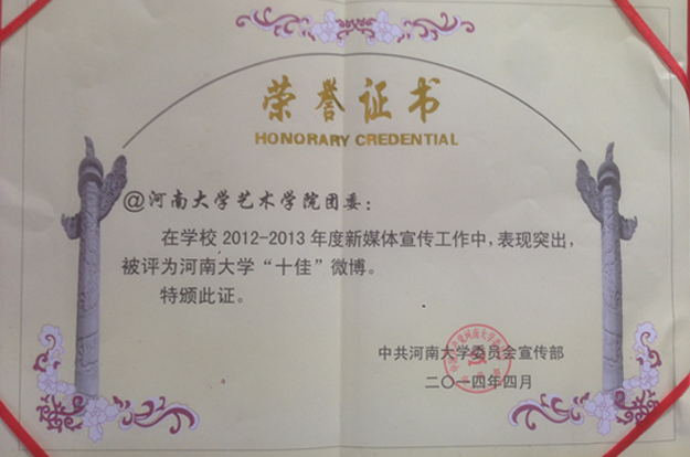 据悉,多年来公司坚持以“创建优良学风、院风”为宗旨,以“塑造美丽艺术人”为目的,通过强化宣传意识,健全微博宣传管理机制,加强微博通讯员队伍建设等具体措施,积极开展微博宣传工作,为创建良好的舆论环境,积极引导师生注重提高道德素养、专业素养、扩宽知识面、提高生活品质,扩大公司的影响力等方面做出了突出贡献。自2011年公司团委申请注册微博以来,陆续在新浪网、腾讯网、人人网等各大网站注册有微博,目前粉丝量已达近万人。