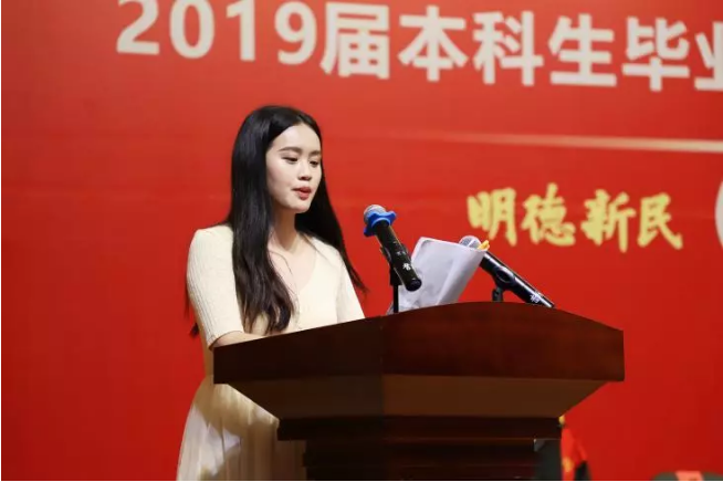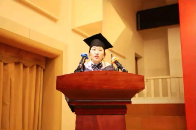 仪式正式开始前,毕业生代表声情并茂的朗诵“我和‘她’的青春四年”,怀念自己的四年大学时光。