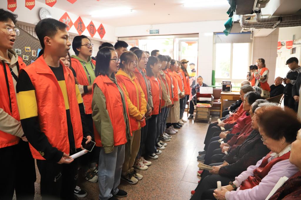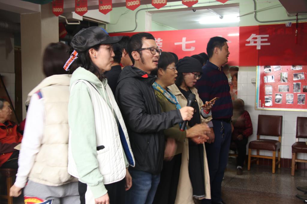 感人的一幕发生在师生们的演出结束后。养老中心的“80后合唱团”回赠了师生们一曲《歌唱祖国》。这是由十几位80岁以上的老人组成的合唱团,这些乐天派的老人们自称为“80后”。虽然演唱的中气已显不足,但每位老人都唱得非常投入。师生们也纷纷为他们打拍、伴唱、鼓掌助兴。整场慰问演出就在这样其乐融融的氛围中圆满落幕。演出散场后,师生们又和老人们一起来到养老院中的影壁墙前集体合影留念,然后方和老人们依依惜别,结束了这次有意义的爱心敬老行。
