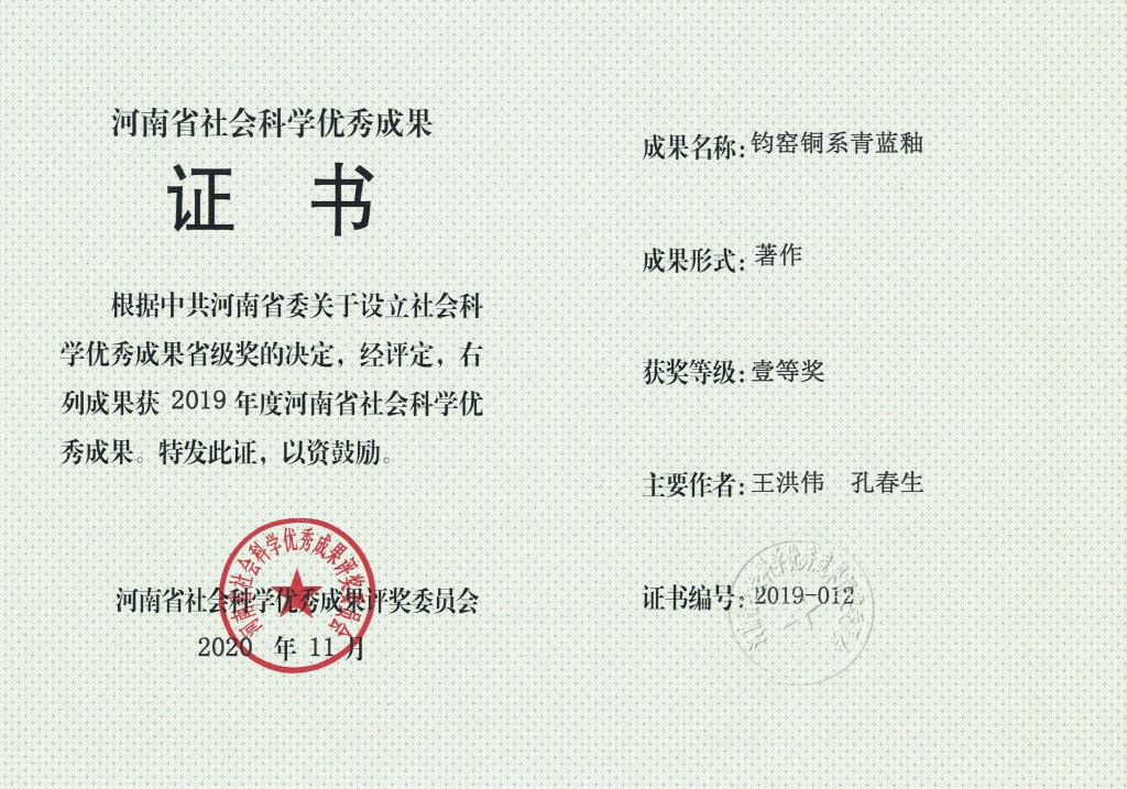 《钧窑铜系青蓝釉》荣获河南省社会科学优秀成果一等奖