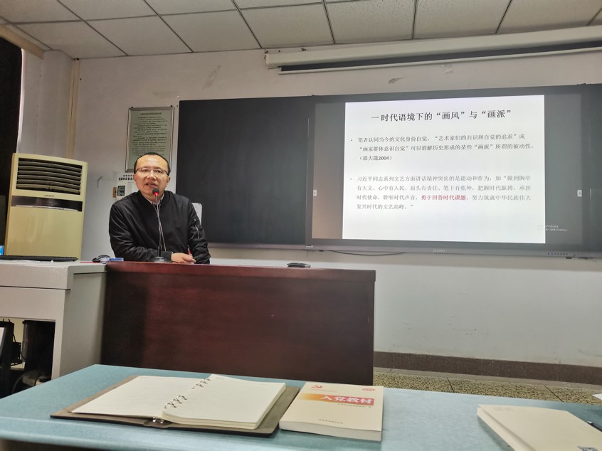 席卫权从时代语境下的“画风”与“画派”、“中原画风”的内涵阐释、批评与自省等方面展开讲述,结合时代时事强调艺术工作、美育教育的重要性,引导入党积极分子们树立全局意识,扎根厚土,不辱使命,成为有责任、有担当的时代新人。