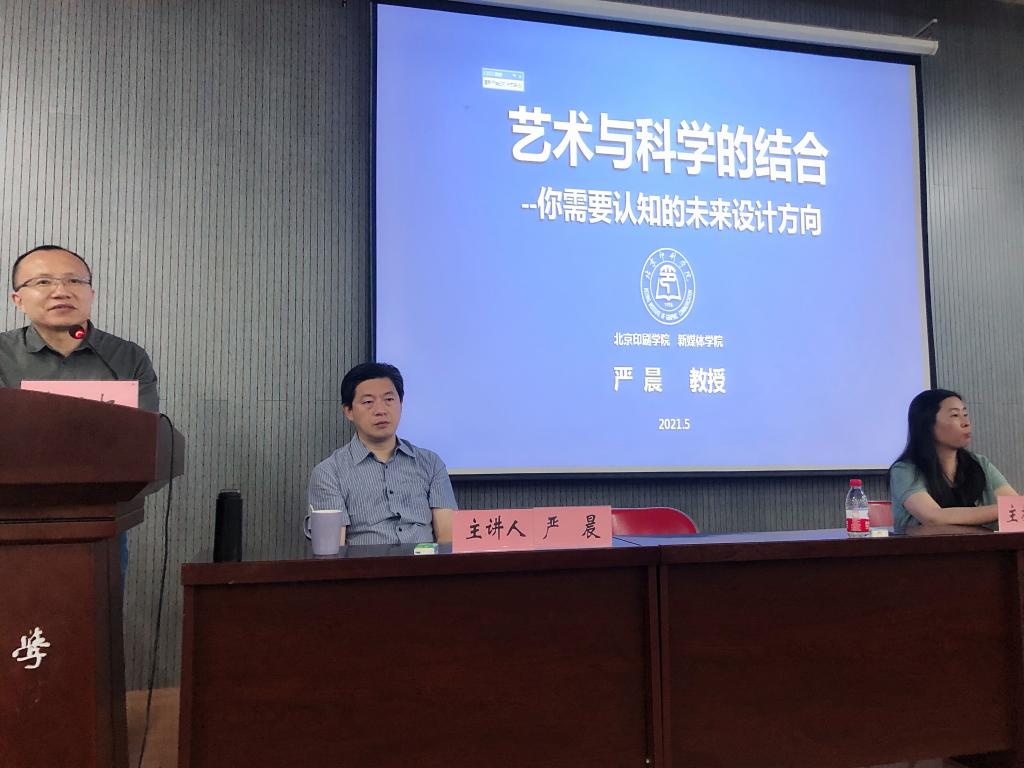 2021年5月26日上午9:30,北京印刷公司新媒体院副经理严晨教授在英国365集团官网405阶梯教室进行了艺术与科学论坛系列讲座第三讲——《艺术与科学的结合——你需要认知的未来设计方向》专题讲座。参加讲座的有英国365集团官网经理席卫权、副经理蔡玉硕、动画系副主任倪娜以及各专业的教师与同学。蔡玉硕副经理主持了本次讲座。