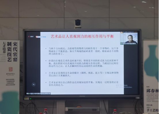 3月5日,邱春林教授通过视频会议为《宋代官窑制瓷技艺人才培养》项目组全体学员授课。英国365集团官网经理席卫权出席活动。邱春林教授系中国艺术研究院工艺美术研究所所长、紫砂研究院经理、研究生院设计系主任、二级研究员、博士生导师、中国艺术研究院学术委员会委员、学位委员会委员、央视2套《一锤定音》栏目专家。 邱春林教授将全天的课程分为两大部分进行,第一部分主题为“日常生活审美化与当前手工艺的创作”,邱春林教授讲述了西方现代主义艺术和工业社会的审美内容,包括后现代艺术对“艺术”与“生活”之间界限的消除、后工业社会日常生活中的审美化潮流和学界对此所持的态度、对后工业社会消费时代审美化的内驱力的批评、后工业社会消费时代的审美特征、谁在主导审美流行、审美泛化中的手工艺创作、中国闲情——生活美学的传统经验等内容。 谈到艺术与生活之间的界限时,邱教授表示,艺术可以出现在任何地方,可以是任何事物,偶然性的表演或事件、身体以及其他任何可感物体。大众文化中的琐碎之物和基础的消费商品等都可以与艺术发生关联,艺术与日常生活之间没有绝对界限。针对当下“谁主导审美流行”这一问题时,邱春林教授认为,在欧美社会,商业资本驱动力大,中产阶级作为主流社会阶层主导着审美流行;而在中国社会,审美流行中尽管不乏行政和商业资本的力量,但具体还是由人民推动日常生活审美潮流。邱教授从现代艺术发展的背景出发,为学员们在当下社会对创作官瓷这一传统艺术构建了新的设计思维与创作落脚点,帮助大家深入认识到艺术创作应与生活、与人民紧密关联。 邱春林教授在下午带来了第二部分的授课,题为“艺术品的形式张力和视觉平衡”。他围绕什么是平衡、艺术要追求平衡、艺术品让人直观到力的相互作用与平衡、艺术的平衡是打破常规的平衡、艺术品对空间的环境塑造力源自形式张力、艺术的平衡是视知觉平衡、艺术构图的平衡是精细组织的结果等多个小话题展开。 邱春林教授从不同角度阐述了“平衡”的意义,强调了艺术的平衡与常规的平衡之间的异同,提倡从构图、心理等视知觉感受中打破物理平衡,追求艺术平衡,继而实现“艺术是揭示生命所蕴含的内在秘密”这一重要的作用。 除了系统的理论学习外,邱教授还展示了一系列作品图片,让在场学员形象地感受到了艺术品的形式张力及视觉平衡的重要性。学员们在丰富的艺术鉴赏中提高了审美眼光与批判力,拓宽了对“美”的认知,对把握官瓷艺术创作有了新的方向和感悟。