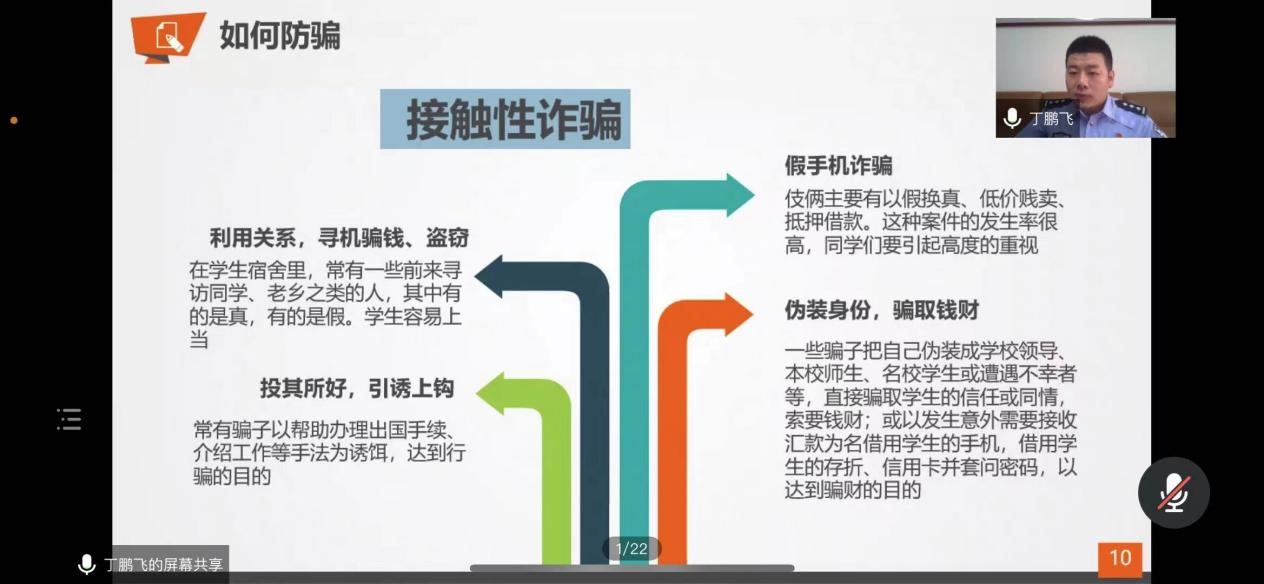 除此之外,丁队长还系统的揭示了一般性诈骗活动的主要步骤和手段,使同学们更加清晰的了解犯罪分子的套路与方法,从而能更好避免这些问题。讨论环节中,同学们也积极的将自己在生活的经历与丁队长进行分享,从而获得了更多的自我保护方法。