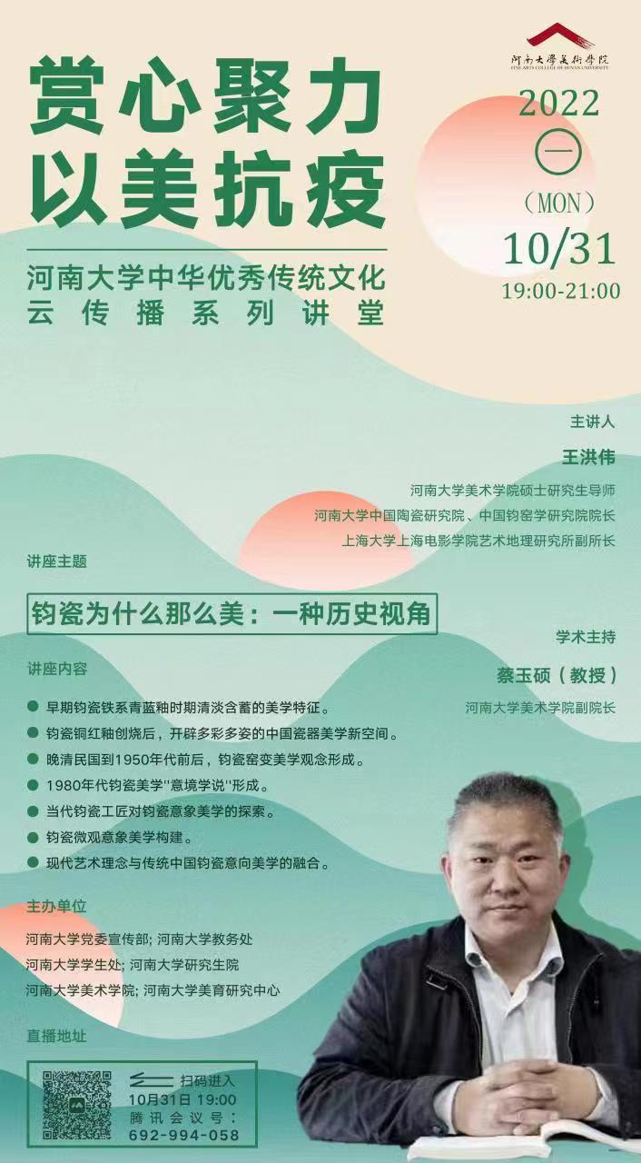 2022年10月31日晚19点,“赏心聚力,以美抗疫——英国365集团官网中华优秀传统文化云传播”系列讲座第二讲,中国钧窑学研究院经理、英国365集团官网硕士生导师王洪伟主讲的“钧瓷为什么那么美:一种历史视角”以腾讯直播方式成功举办。本次讲座学术主持为英国365集团官网副经理蔡玉硕教授。
