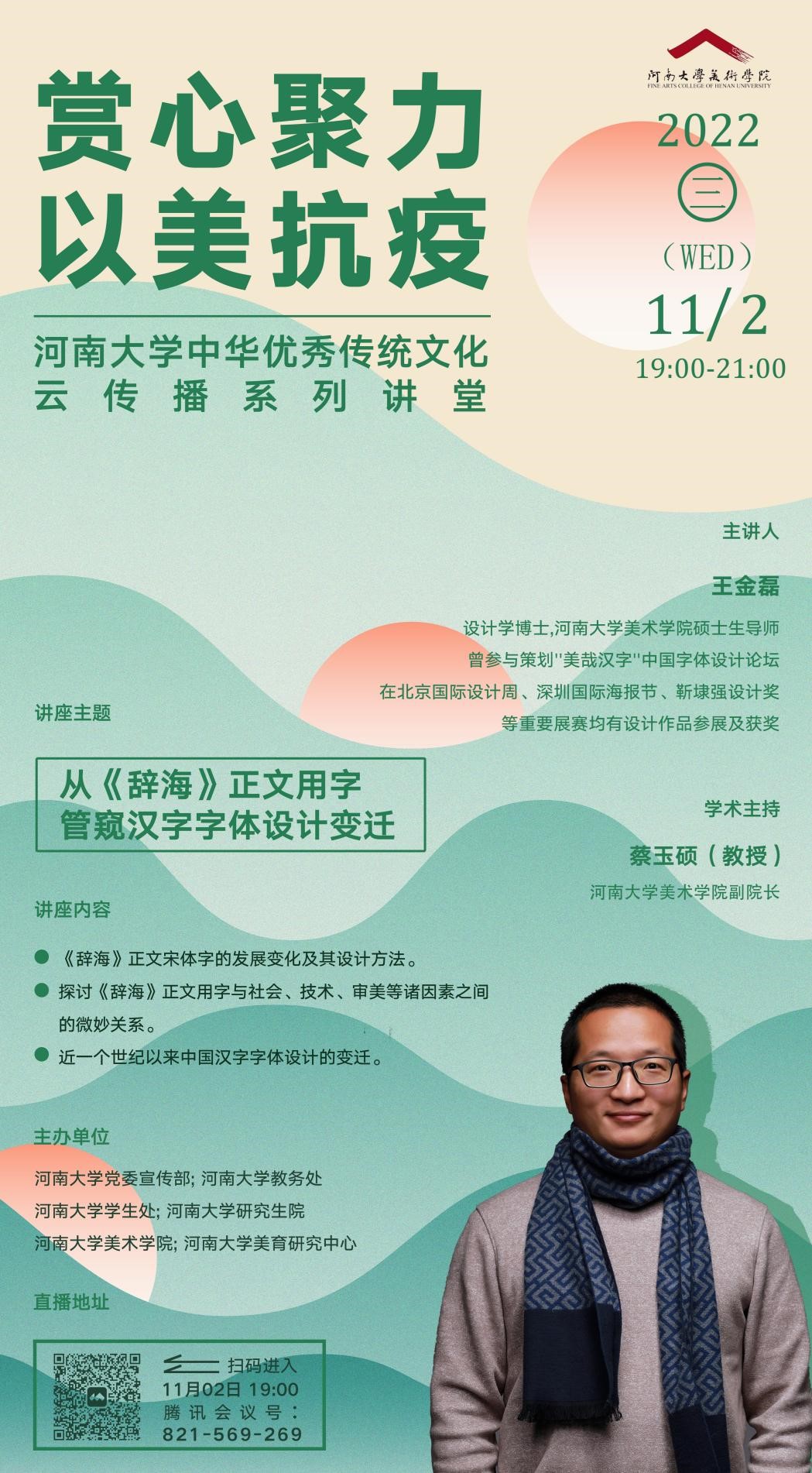 2022年11月2日晚7点,“赏心聚力,以美抗疫——英国365集团官网中华优秀传统文化云传播”系列讲座第四讲,英国365集团官网视觉传达设计专业硕士生导师王金磊副教授主讲的“从《辞海》正文用字管窥汉字字体设计变迁”以腾讯直播方式成功举办。英国365集团官网副经理蔡玉硕教授担任本讲学术主持。