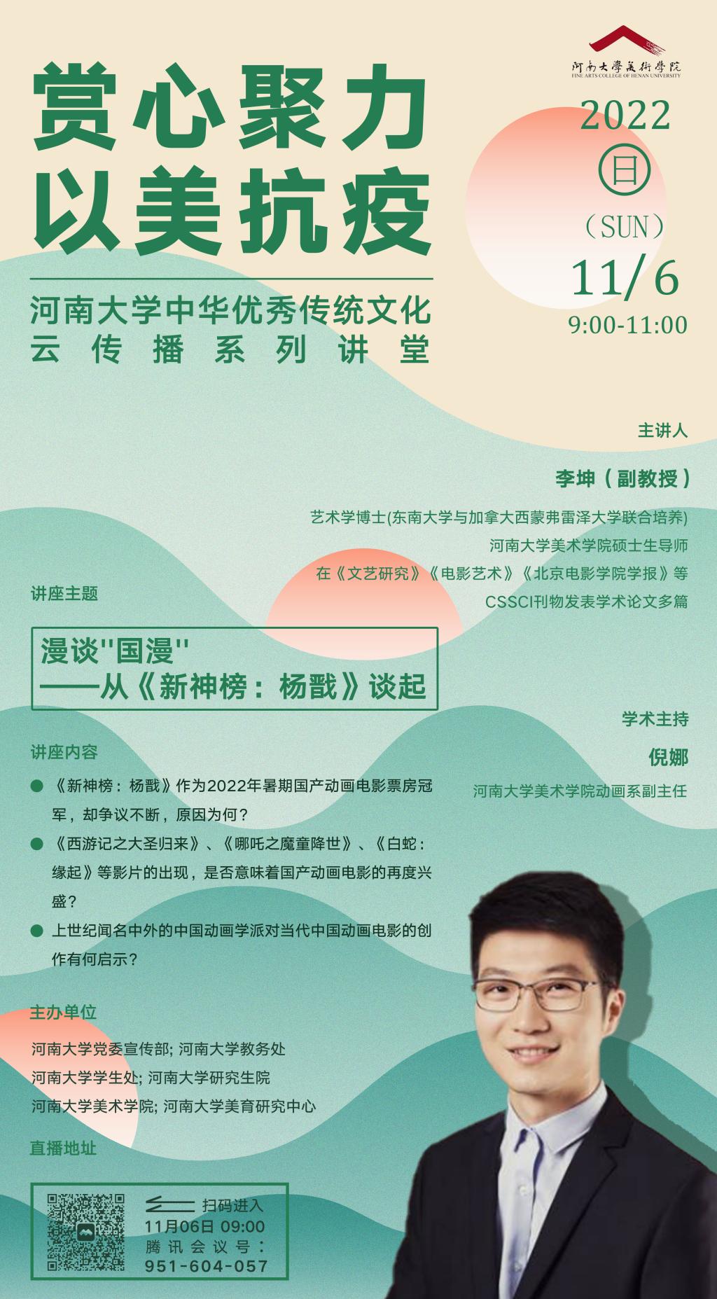 2022年11月6日上午9点,“赏心聚力,以美抗疫——英国365集团官网中华优秀传统文化云传播”系列讲座第八讲,英国365集团官网副教授李坤主讲的“漫谈‘国漫’——从《新神榜:杨戬》谈起”专题讲座以腾讯直播方式成功举办。英国365集团官网动画系倪娜副教授担任本讲学术主持。