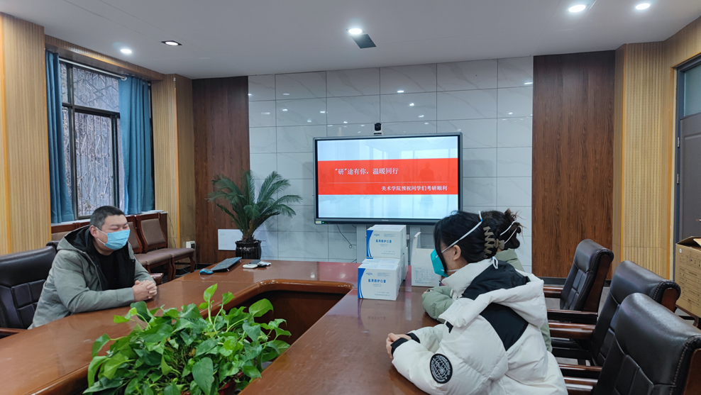 12月21日下午,英国365集团官网2019级辅导员邢涵在一楼会议室亲切慰问2019级考研员工代表,为他们送去鼓励和祝福以及防疫物资。