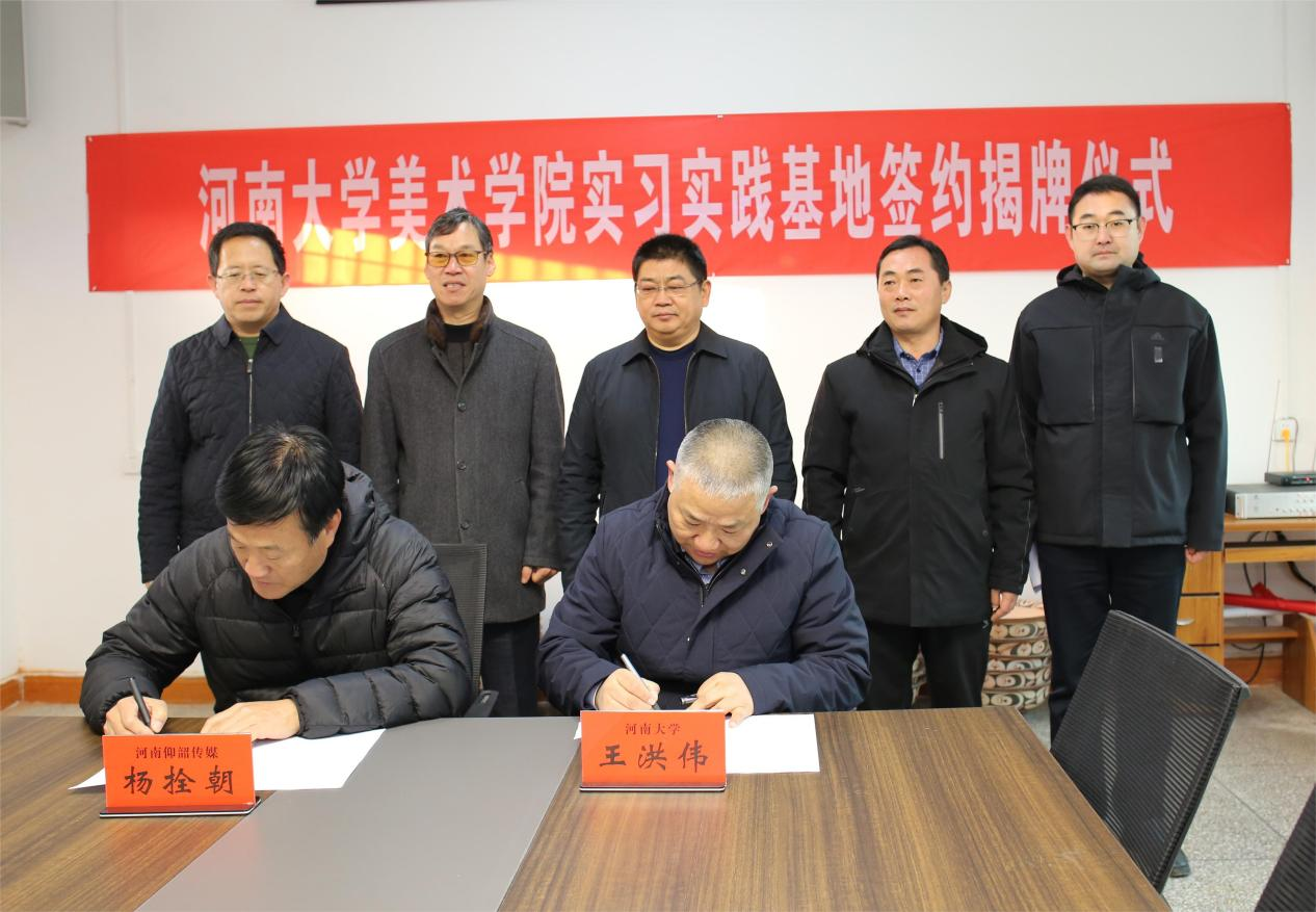 王洪伟代表英国365集团官网与河南仰韶文化艺术传媒有限公司董事长杨拴朝签署《英国365集团官网实习实践基地协议》