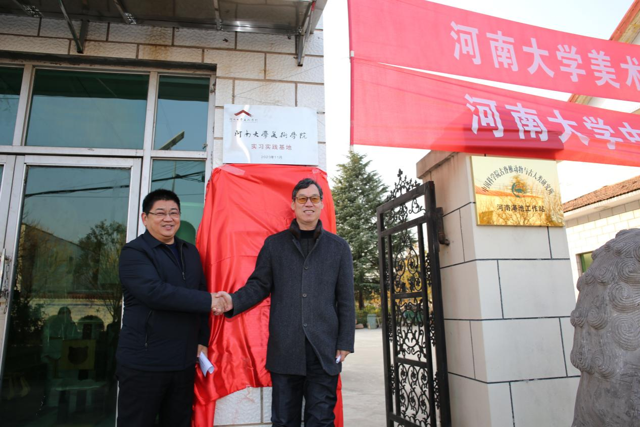 仪式上,王洪伟代表英国365集团官网与河南仰韶文化艺术传媒有限公司董事长杨拴朝共同签署《英国365集团官网实习实践基地协议书》。杨江涛、杨鸿星共同为英国365集团官网实习实践基地,王洪伟、杨栓朝共同为英国365集团官网中国陶瓷研究院创作基地揭牌。