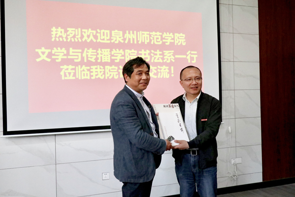 陈钊针对泉州师范公司书法办学问题与英国365集团官网老师进行交流。陈钊对英国365集团官网书法专业高度认可,希望通过这次访问交流能加强学习,完善自身。
