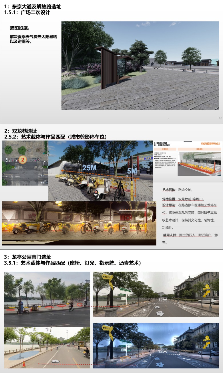 工作坊将时空、环境、人进行了深度融合,结合文化+科技+艺术创新理念,增加交互游戏装置,如夜光跷跷板等,改变地区活动单一的情况,满足儿童的需求。增设引导装置,灯光装置等基础配套设施,路边停车区添加龙形艺术停车位;在部分小广场设置艺术媒体休闲椅和个性化灯光装置,满足城市居民的体验感;在十字路口设计艺术化斑马线,在道路沿岸线增加艺术故事投影,有更好的引导与警醒作用,同时也丰富了地面、周边环境、空间界面的视觉合理转换。