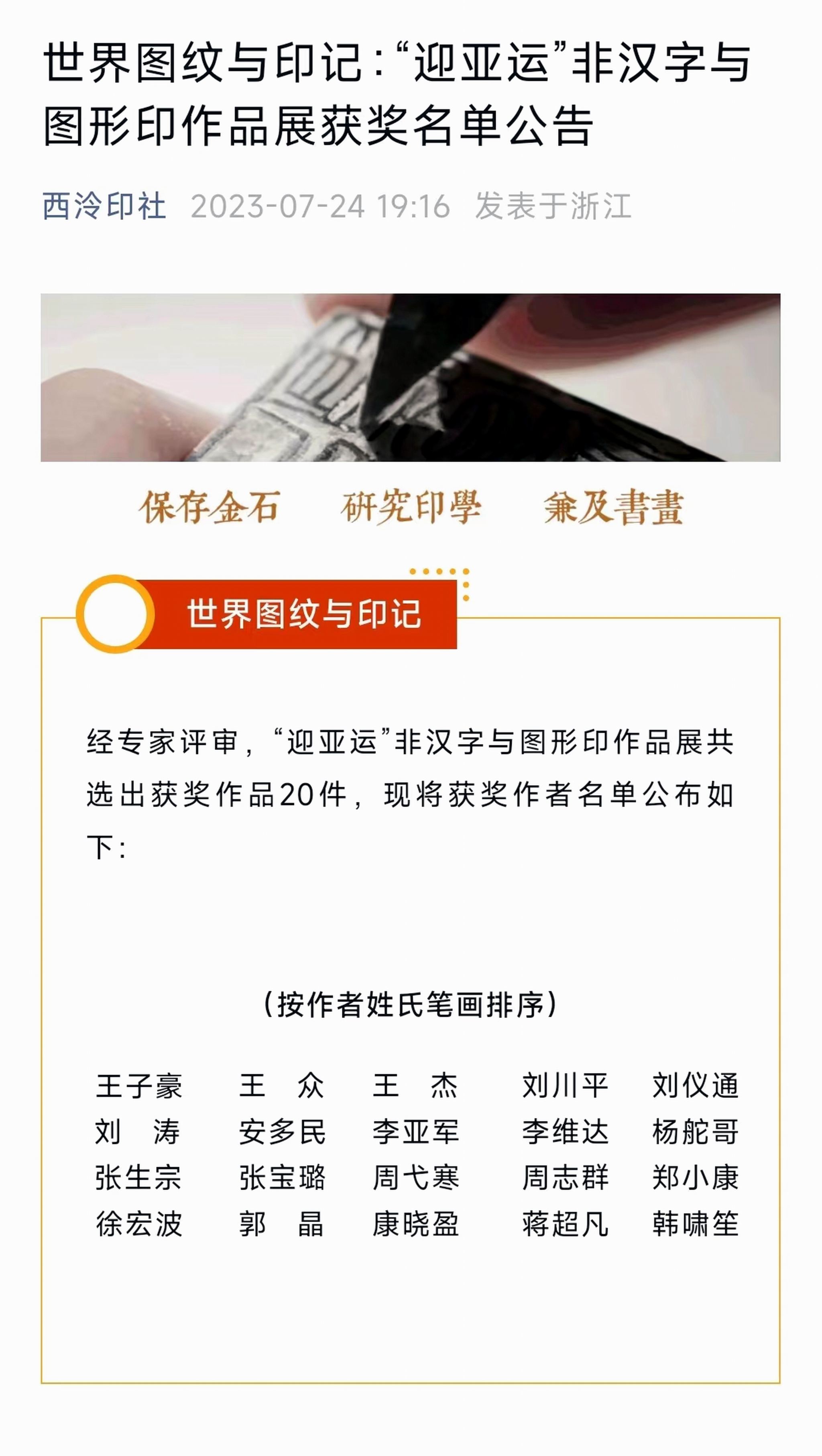 2023年3月,英国365集团官网书法系成立了“非汉字与图形印创作实践工作坊”。在自愿报名的基础上,公司组织8名本科生、1名学术型硕士研究生参加了由西泠印社主办的“世界图纹与印记:‘迎亚运’非汉字与图形印作品展”,书法系主任王梦笔副教授担任工作坊指导教师。工作坊充分利用员工课余时间,前后共进行创作辅导教学7次。日前,西泠印社公布本次展览结果,2021级书法学专业康晓盈同学喜获“优秀作品奖”,实现了此专业自成立以来在读本科生在西泠印社举办的国家级单项展览中获奖零的突破。