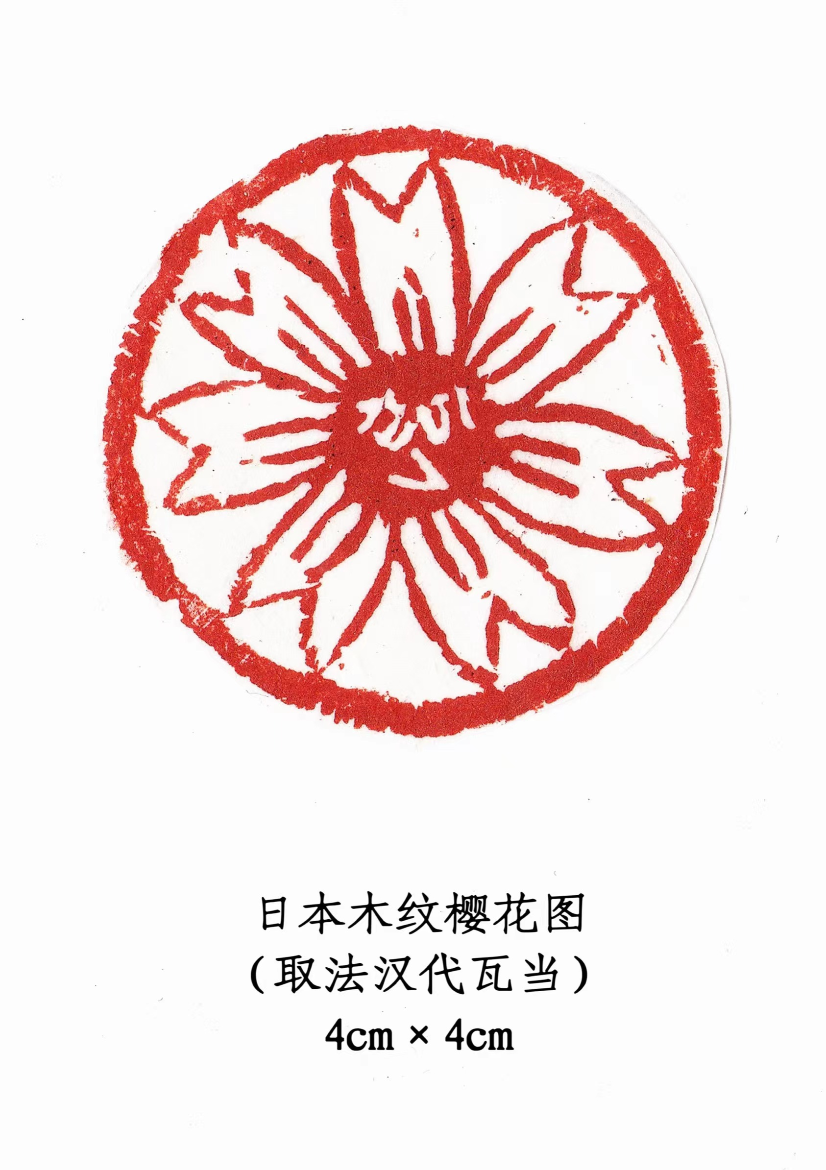 创作感受:我选择参加亚运会国家中的日本,说起日本便会想起富士山下的樱花。选取樱花为代表,想要体现出古朴气息又参考汉代瓦当,将樱花置于瓦当之中,让二者巧妙结合古朴又洋溢着自然的气息。