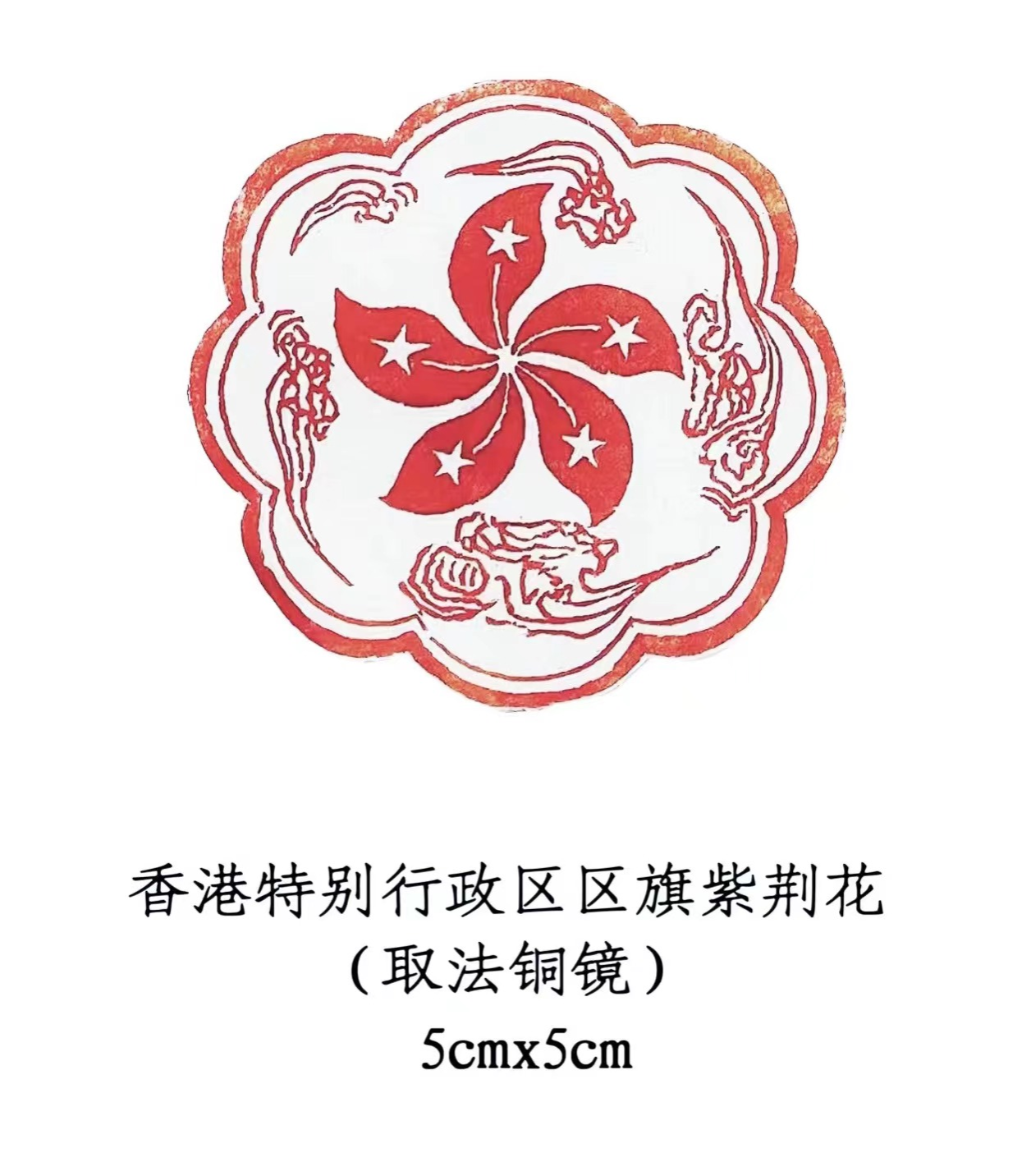 创作感受:此次创作非文字类篆刻作品是一次探索性的挑战,其次此印面以古代铜镜背面纹饰为大框架,添加了不同大小的祥云做内框,居中为香港特别行政区区旗“紫荆花旗”,寓意祝福香港。