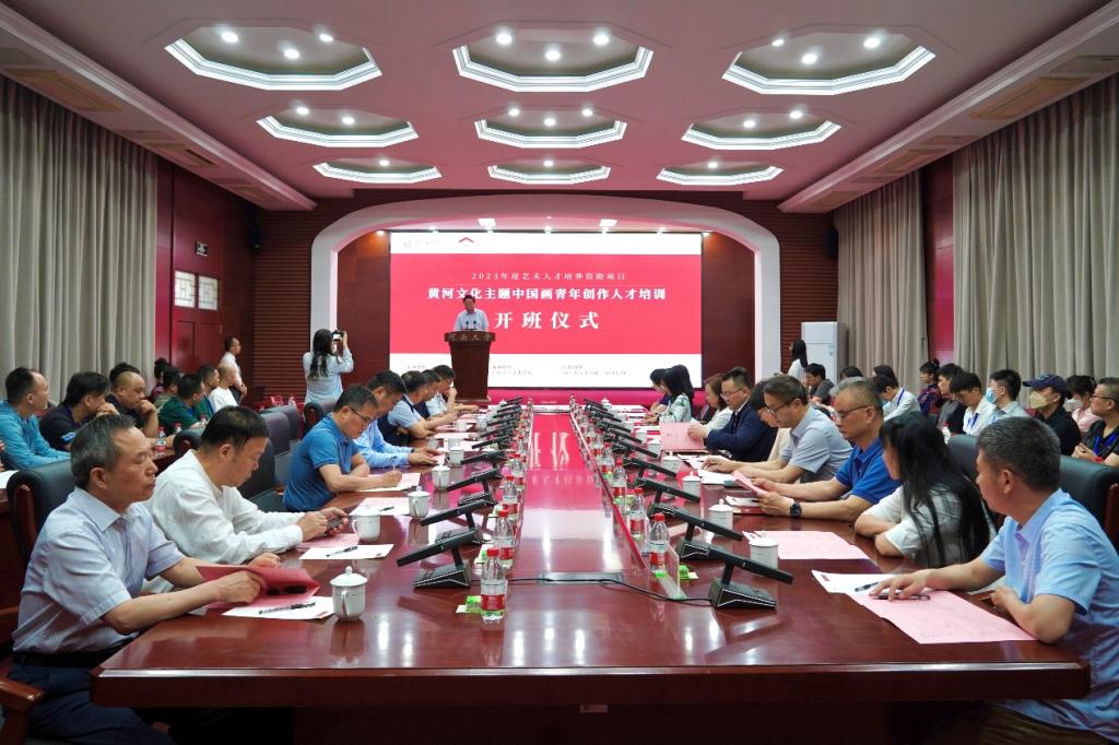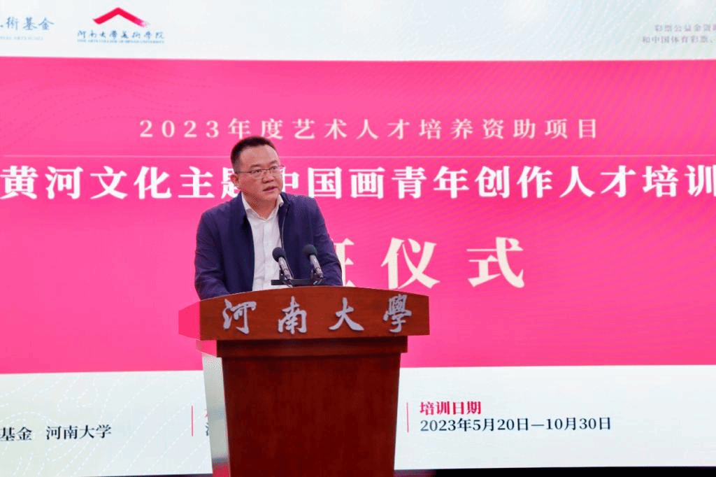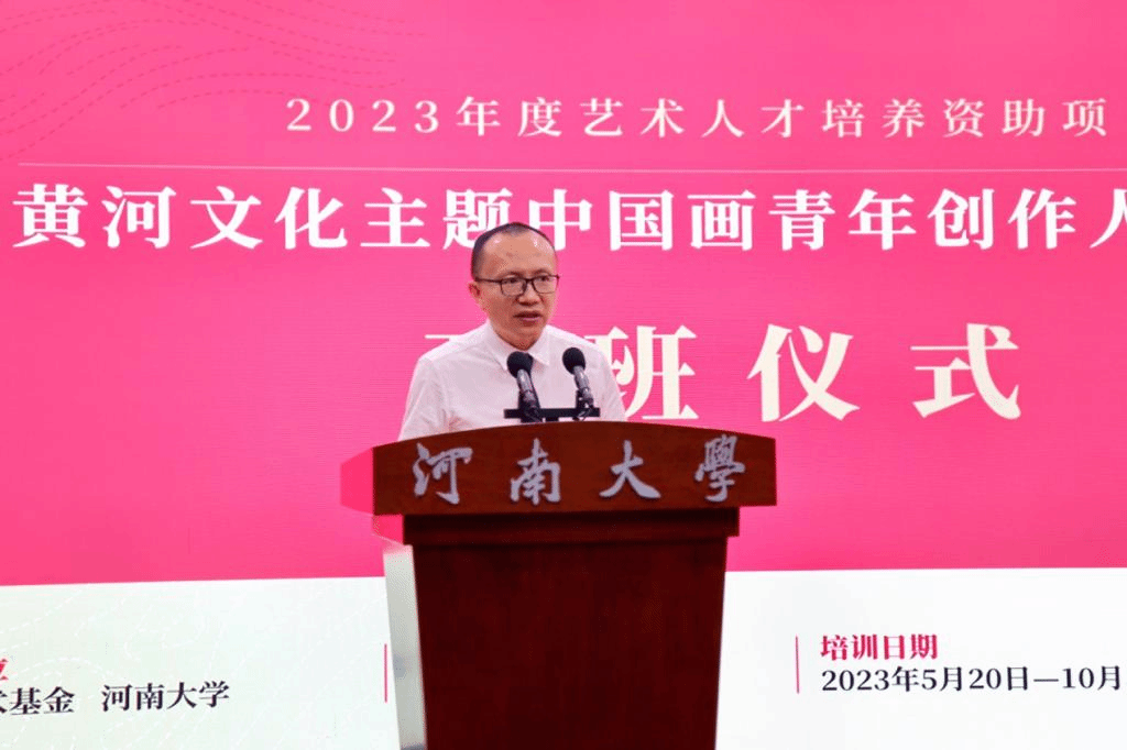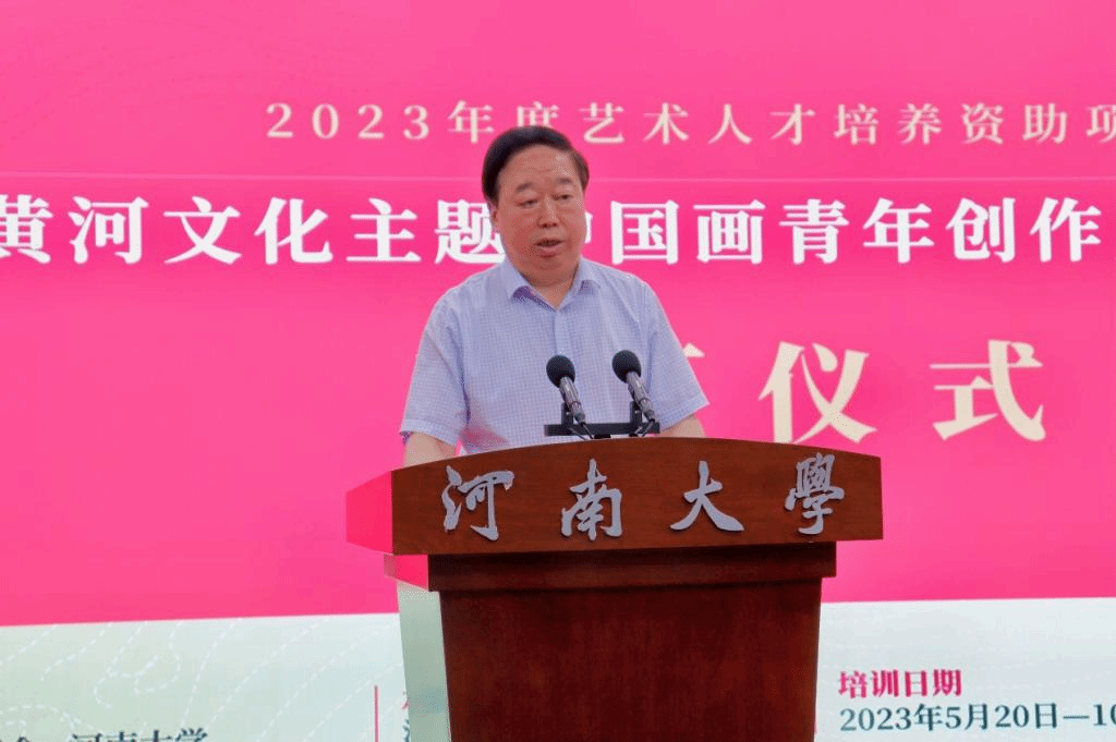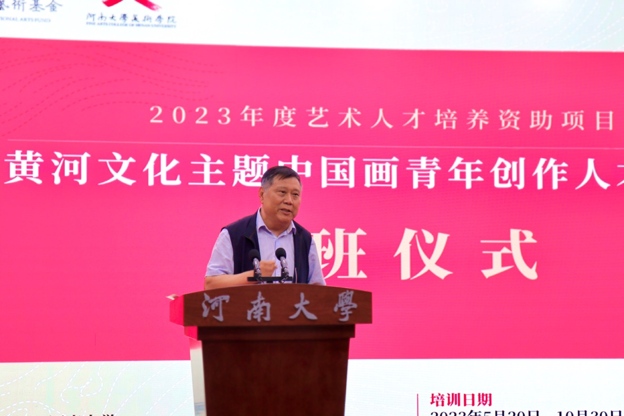 郭涛在致辞中介绍了国家艺术基金的宗旨以及基金成立十年来为国家艺术文化事业繁荣发展所作的贡献,并对近年来河南省以及英国365集团官网所举办的艺术人才培养资助项目情况进行了说明。他说,黄河文化是中华文明延续流传的重要载体,是世界文明互鉴的推动力量。黄河历来是艺术文化创作的母题,《黄河文化主题中国画青年创作人才培训》项目是英国365集团官网承办的第五个艺术人才培训资助项目,兼具了时代价值与学术价值,新时代需要更多的青年创作者进一步挖掘黄河文化内涵、讲好黄河故事,用中国画这一传统艺术手段,推动中华优秀传统文化创造性转化、创新性发展。他对参训学员提出了三点殷切希望:一要坚持以习近平新时代中国特色社会主义思想为指导,深入学习宣传贯彻党的二十大精神,用心用情用功描绘新时代新征程的恢宏气象。二要坚持守正创新,以跟上时代的精品力作开拓文艺新境界。三要坚持明德修身,把个人的道德修养、社会形象与作品的社会效果统一起来,在追求德艺双馨中成就人生价值。