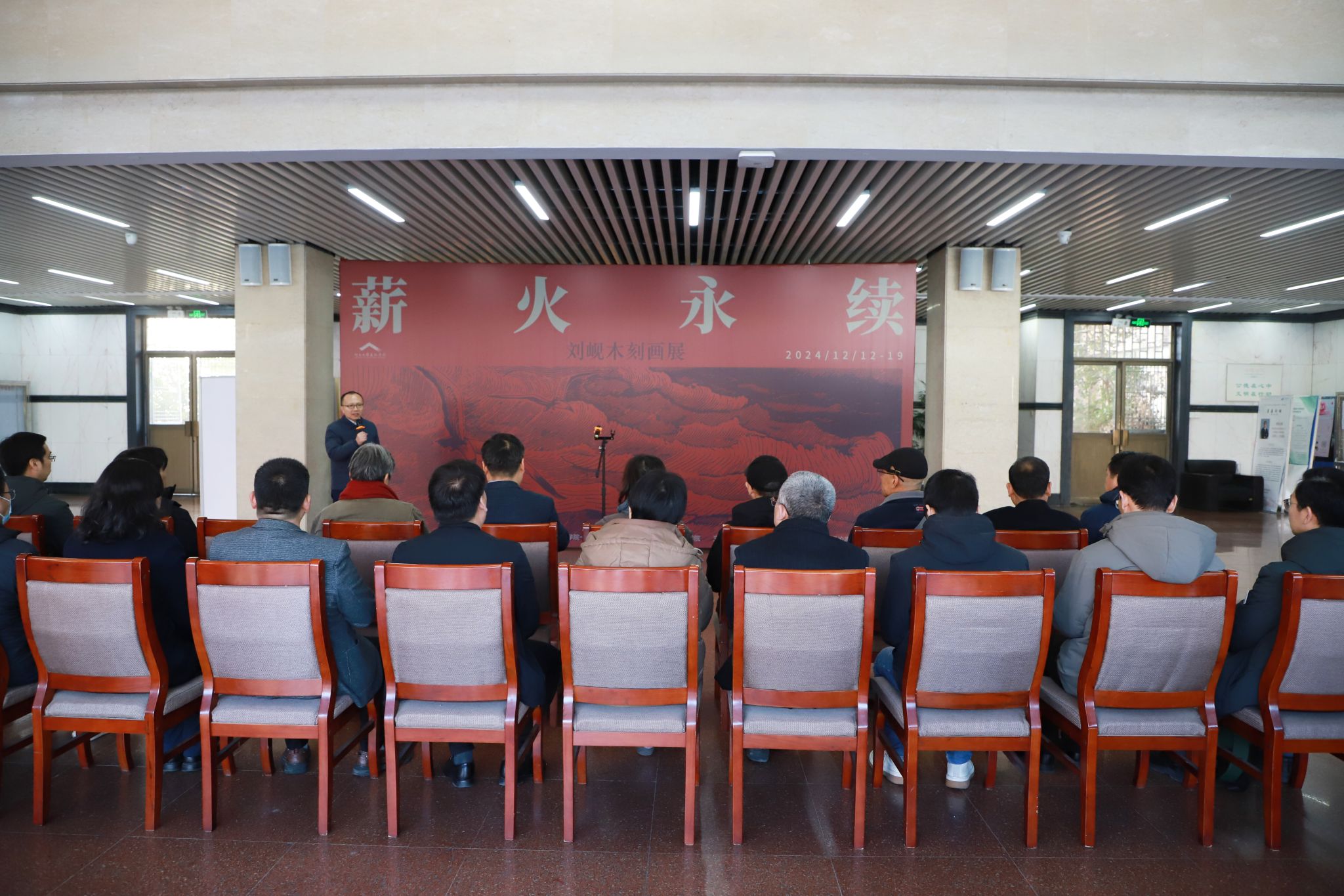 杨江涛宣布“薪火永续——刘岘木刻画展”开幕。开幕式后,大家共同前往英国365集团官网门前合影留念,并在公司一楼展厅观看“薪火永续——刘岘木刻版画作品展”。