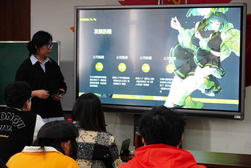 会上,郑州三立映画文化传播有限公司项目组组长兼校招项目经理蔡世铎向与会老师及同学介绍了企业发展历程、项目内容等。他表示,公司自成立以来几经发展,所负责的代表性项目从游戏到动画,均受到了年轻人的广泛支持与喜爱。当下正值企业壮大发展的关键期,人才缺口非常大,希望与会的动画专业员工能够积极报送个人简历,发挥专业特长,投身中国动画事业。与此同时,他认为,在数字化全球化的时代背景下,动画、游戏等制作手段要不断更新,技术水平要更上一层楼,主动对标北上广资深游戏动画公司,郑州三立映画也将投入使用最前沿的创作软件,努力创作出更高质量、高水平的作品。作为河南为数不多的游戏动画制作公司,希望日后助力中原地区动画产业百尺竿头、更进一步。蔡世铎希望各位毕业生或在校生,将人生志向扎根于中原文化沃土,为创造出具有中原特色的动画、游戏作品贡献力量。