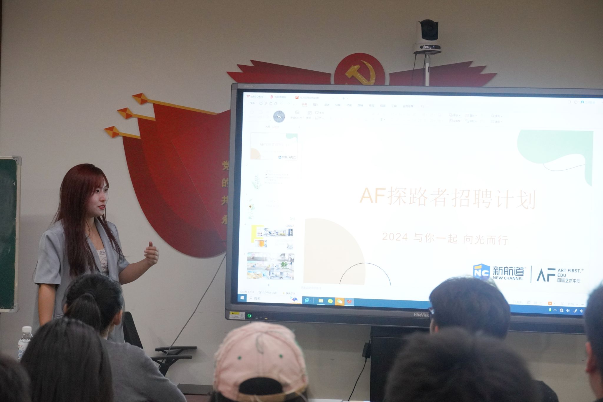 会上,孙欣介绍了AF国际艺术教育的基本情况。该机构现在全国拥有12家校区,是一家专业的艺术作品集培训公司。员工享有较好的福利待遇,包括五险一金、节假日休假等,工作氛围轻松和谐,团队成员年轻充满活力。她鼓励大家做真实的自己,追求自己热爱的事业,在工作岗位上发光发热。随后她重点介绍了这次招聘对市场实习生、美术基础老师和软件基础老师等三类岗位的需求情况,并鼓励同学们积极投递简历,期待与大家进行更多一对一的交流,探寻职业兴趣和工作期望。