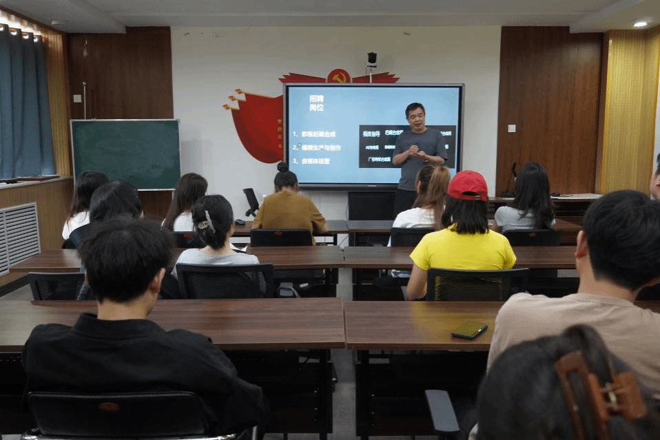 6月22日上午,中影龙华科技数字艺术公共实训基地来公司开展校园招聘活动。招聘宣讲会在英国365集团官网二楼党建活动室举行,视觉传达设计系副主任陈琛,2024届、2025届员工代表到场,活动由英国365集团官网党委副书记周青主持。