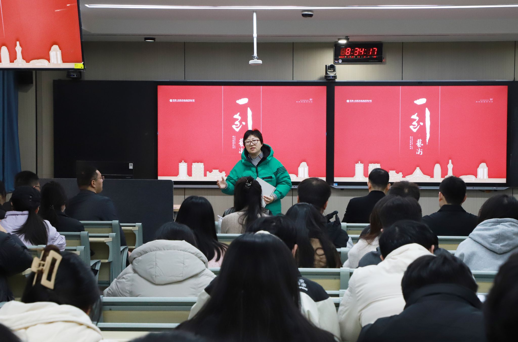 周青向在场师生介绍了河南一创艺术发展有限公司董事长李国庆、创意部总监曹海山等一行,并对他们的到来表示热烈的欢迎。她表示,该公司在其发展的20年里,一直专注于弘扬中华优秀传统文化及时代精神,坚定文化自信,用艺术形式书写中国故事,这与同学们的专业领域和发展追求高度契合。她希望大家正确认识就业形势,树立积极的就业观,把握工作机会,在岗位上历练自我,超越自我,彰显出优秀的职业素养。