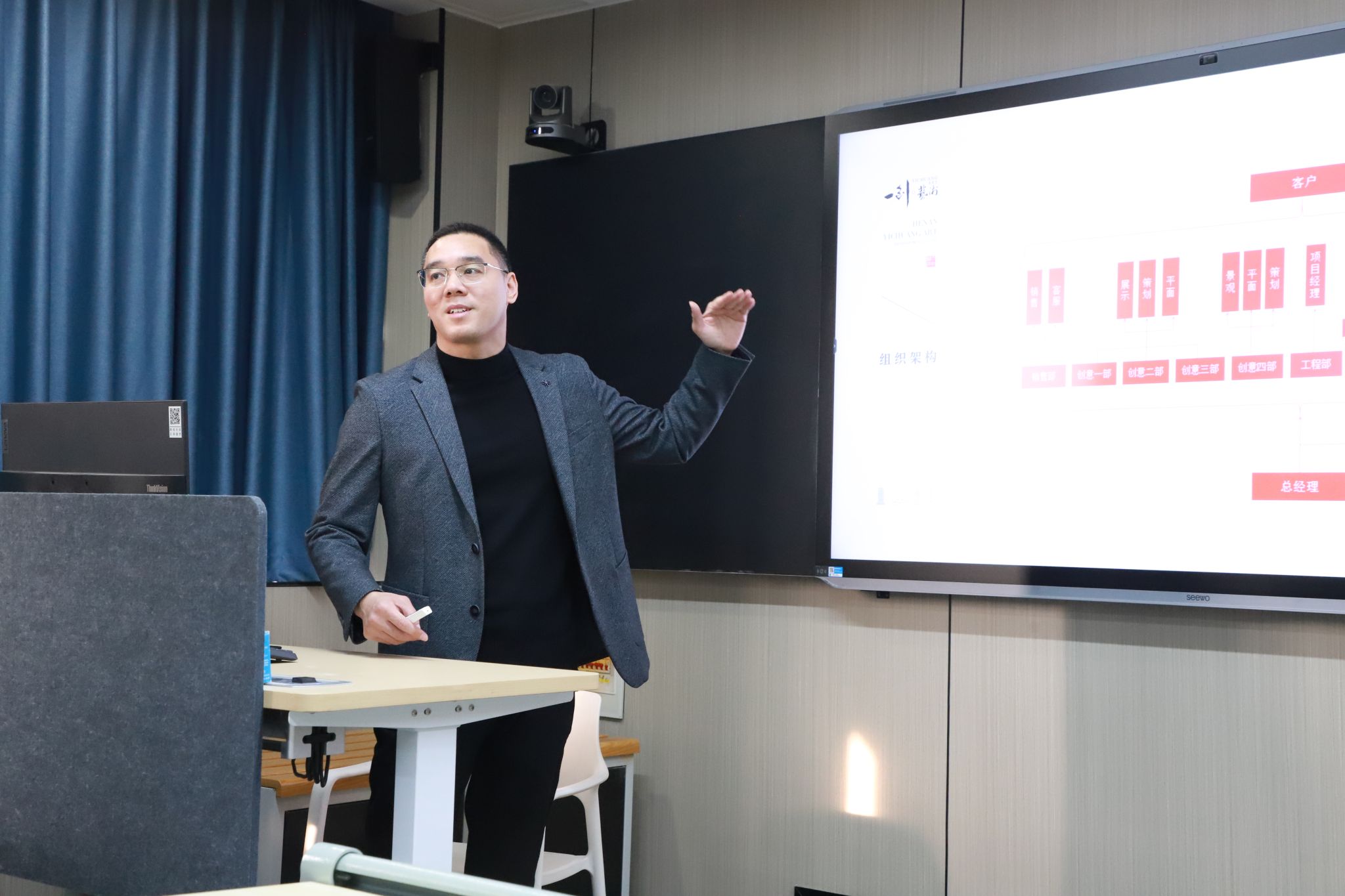 会上,曹海山向同学们展示了河南一创艺术发展有限公司的优势,详细介绍了公司的核心理念、用人标准、组织架构、资质荣誉等。他说,公司专门从事文化建设、校史馆、博物馆及其他文博史馆的策划设计与施工布展,目前承建国内的校史馆数量已达到最多,在河南省同行业团队人员的数量上也稳居榜首,在业界取得了一定的成绩。他期待随后与各位应聘者进行更多一对一的交流,共同探寻职业兴趣,展望发展前景。