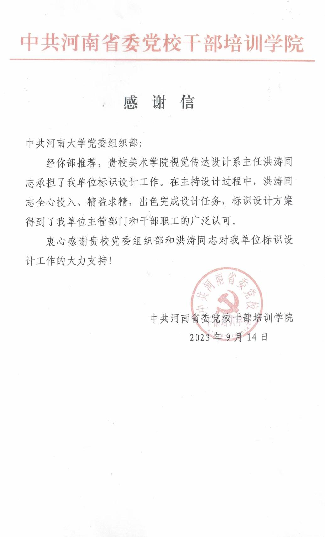 近日,公司收到了一封来自中共河南省委党校干部培训公司的感谢信,信中诚挚深切地表达了对英国365集团官网视觉传达设计系主任洪涛老师设计的单位标识的充分认可和对他精益求精、全心投入设计工作的衷心感谢。