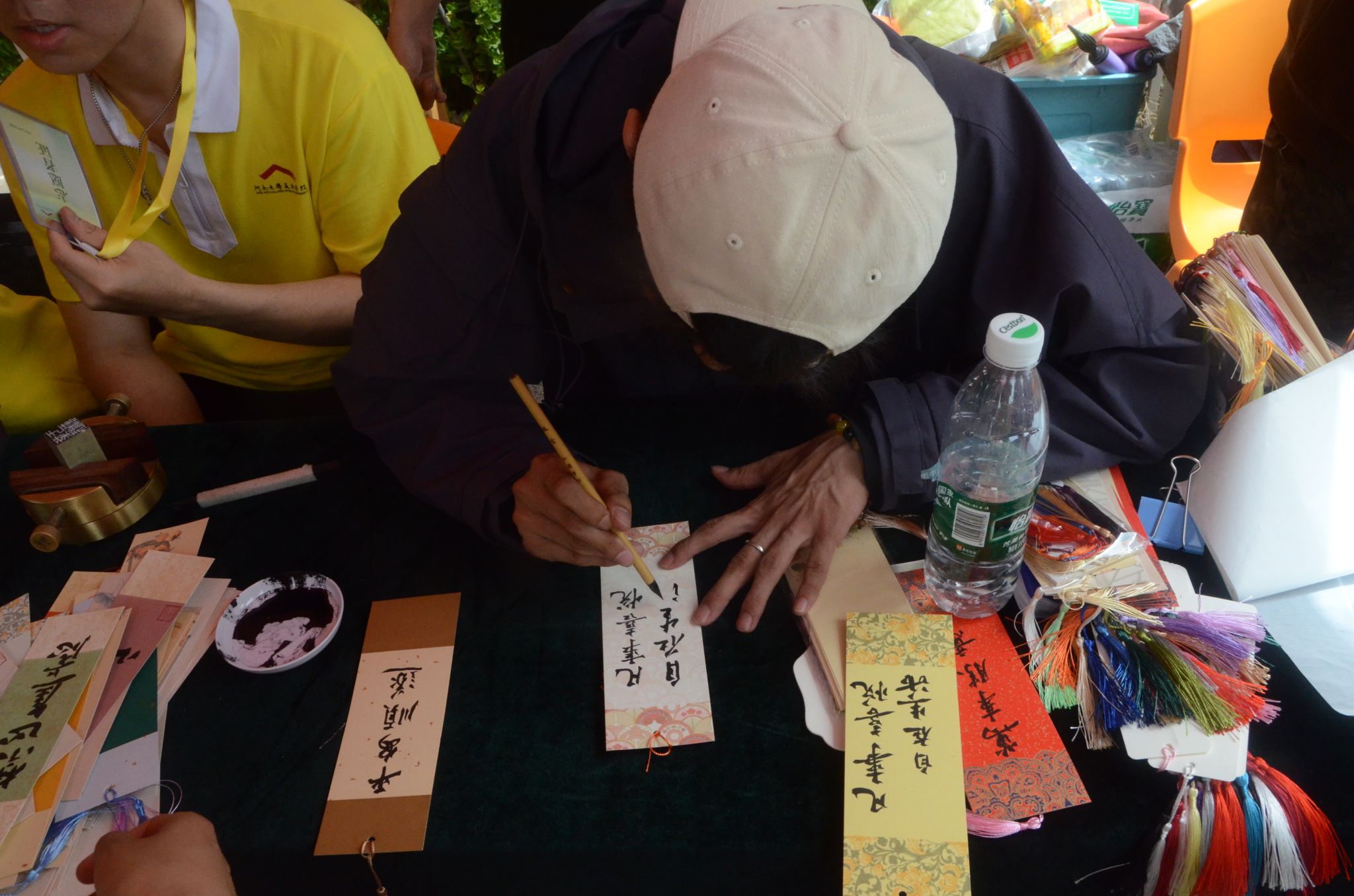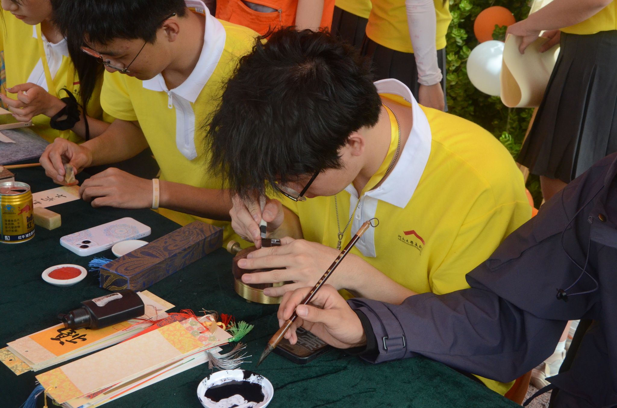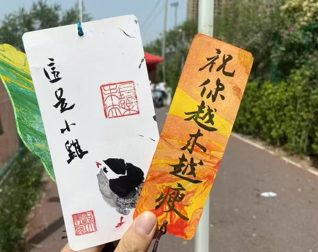 志愿者们笔走龙蛇,行云流水,力与美在此刻同时展现,一场笔墨山河的奇妙探险呈现在同学们面前。同学们不仅观看到国画艺术的生动诠释,更通过每一笔的勾勒感受“外师造化,中得心源”的艺术真谛;不仅感受到篆刻的力量和书法的强劲,更体会到千年文化的魅力与风采。志愿者准备好亲手写的题字印章的书签,将这份祝福赠送给同学们,预祝同学们赛出水平,赛出风采。