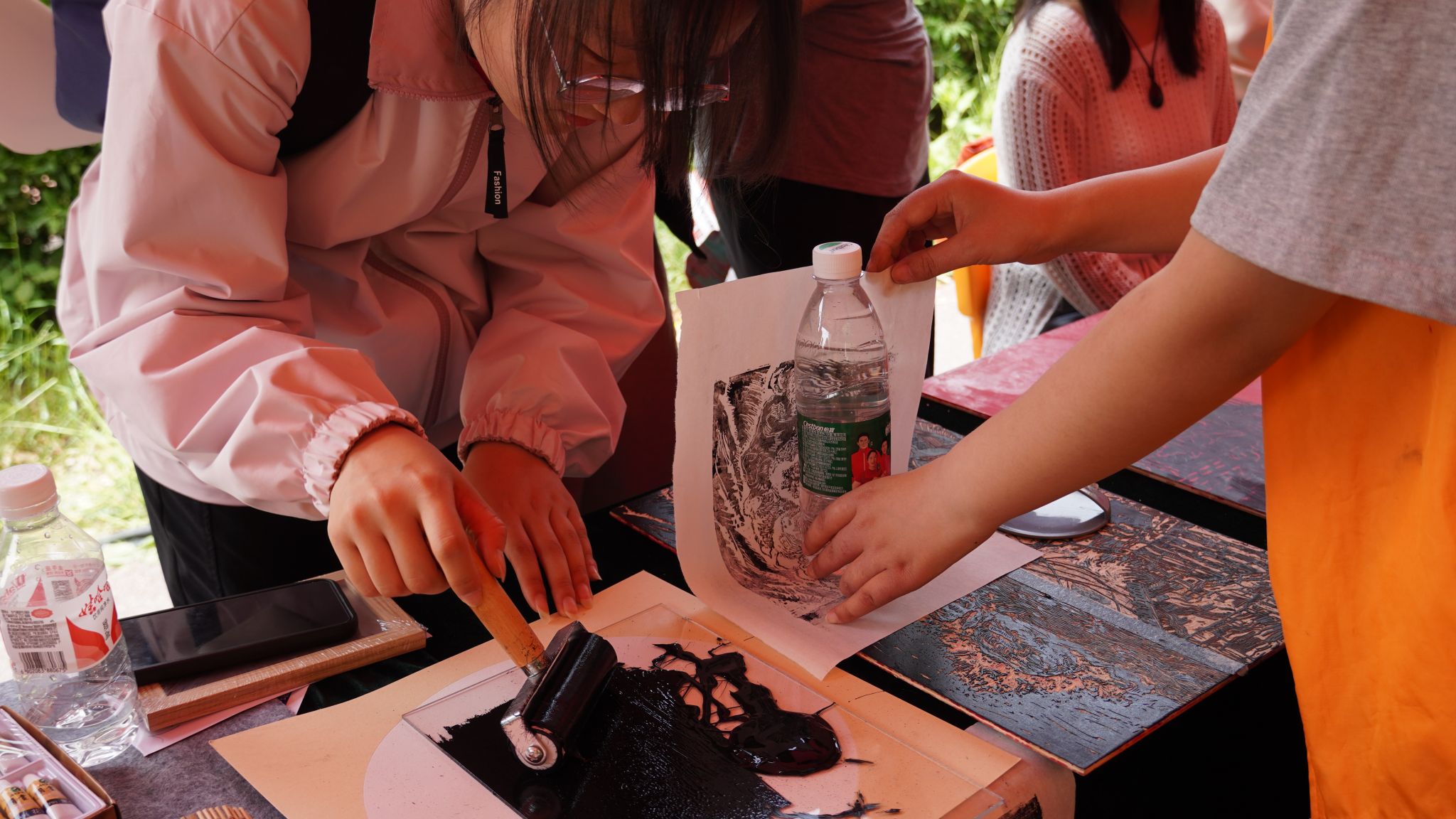 美院志愿者化身“刀笔匠人”,现场演示凸版画技法。锋利的刻刀在木板上起落游走,每一刀都如同运动员的刻苦训练,凝聚着专注与坚持。同学们见证版画从线条到成品的诞生过程,在刀痕与油墨的交织中,体会匠人精神与体育精神跨越时空的共鸣。