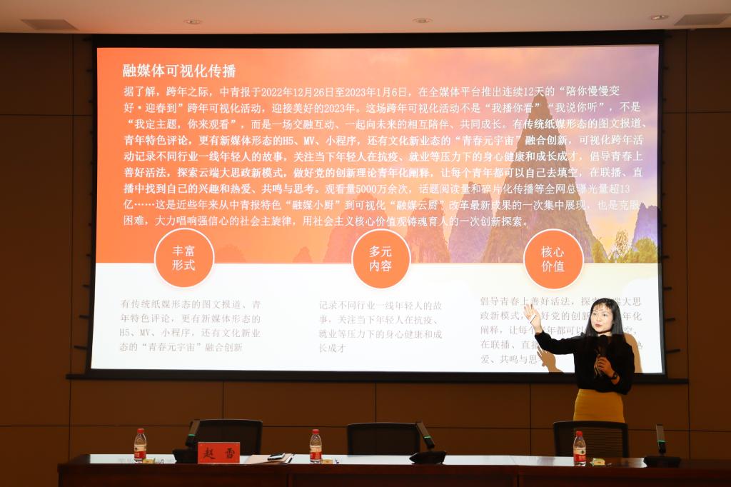 赵雪以新时代融媒体建设与运营为切入点,深入剖析新时代高校团学宣传工作。在党的二十大与团学融媒体建设方面, 2023年是全面贯彻落实党的二十大精神的开局之年,也是英国365集团官网建设“双一流”的重要之年。站在新的起点上,高校团学宣传工作要紧抓党的二十大报告中关于融媒体建设的要求,不断加强全媒体传播体系建设,塑造主流舆论新格局,着力打造创新型团学宣传平台,为公司事业发展营造良好舆论氛围。在团学新闻写作方面,赵雪从概念界定、框架结构、写作技巧等多方面进行详细讲述,表示宣传工作要做到正能量充沛、形式丰富、内容多元,不断提升团学宣传工作的传播力、引导力、影响力、公信力。在团学宣传新作为方面,要坚持以社会主义核心价值观为指引,切实抓好青年思想政治引,汇聚向上向善的精神力量,多措并举做好新时代共青团宣传思想文化工作。