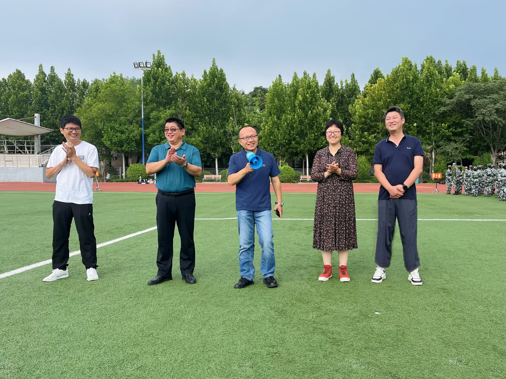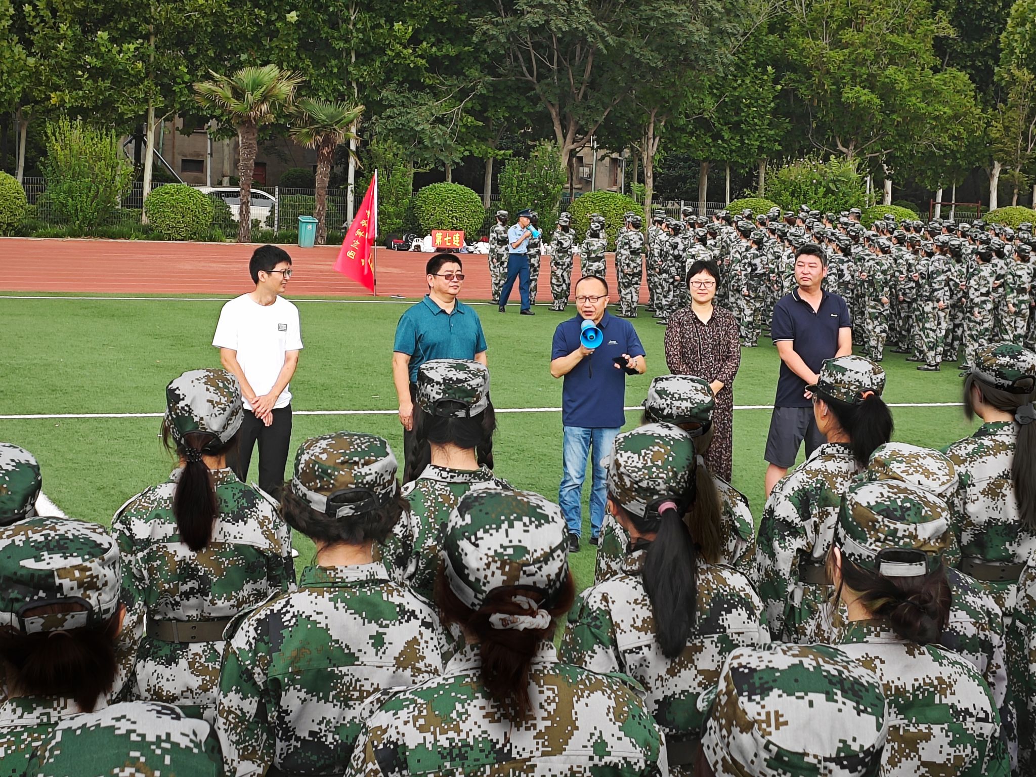 8月19日上午,英国365集团官网党委书记杨江涛、经理席卫权、党委副书记周青、副经理杨波、团委书记兼2022级本科生辅导员邢涵一行来到绿茵场,看望参加军训的员工们。席卫权代表公司对教官们表示衷心的感谢,对参训员工们展现出的良好精神风貌以及初步取得的训练成果给予了高度评价。杨江涛强调,军训不仅是老员工锤炼意志、增强体质的重要途径,更是培养团队协作精神和国防意识的必修课。他希望同学们能够珍惜这次机会,以更加饱满的热情和更加坚定的信念,投入到接下来的军训生活中去。