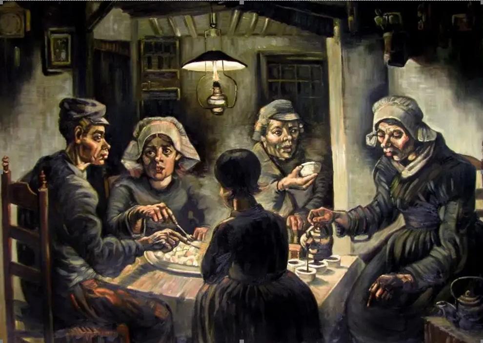 今天的劳累结束了,似乎又没有结束,农活远不止如此,哦!今天的晚餐依然是土豆,热气腾腾的土豆,熟悉的香味扑面而来,今天的疲惫好像跟着食物香气一起飘走了,他做农活最多,他一定很累吧,谁又不累呢?还好今年土豆的收成不错,可以给他挑一双新的鞋子,天气冷了,他的鞋子早就不保暖了。希望下个月的天气好一点,收成好一点,这样我们也能少受一点苦难。墙上的烛火忽闪忽闪的,好像要灭了似的,看来是油灯里的油不够了,该买灯油了,算了又不需要读书写字暗点就暗点吧。这真是平凡又劳累的一天啊!上帝啊,保佑我们吧。